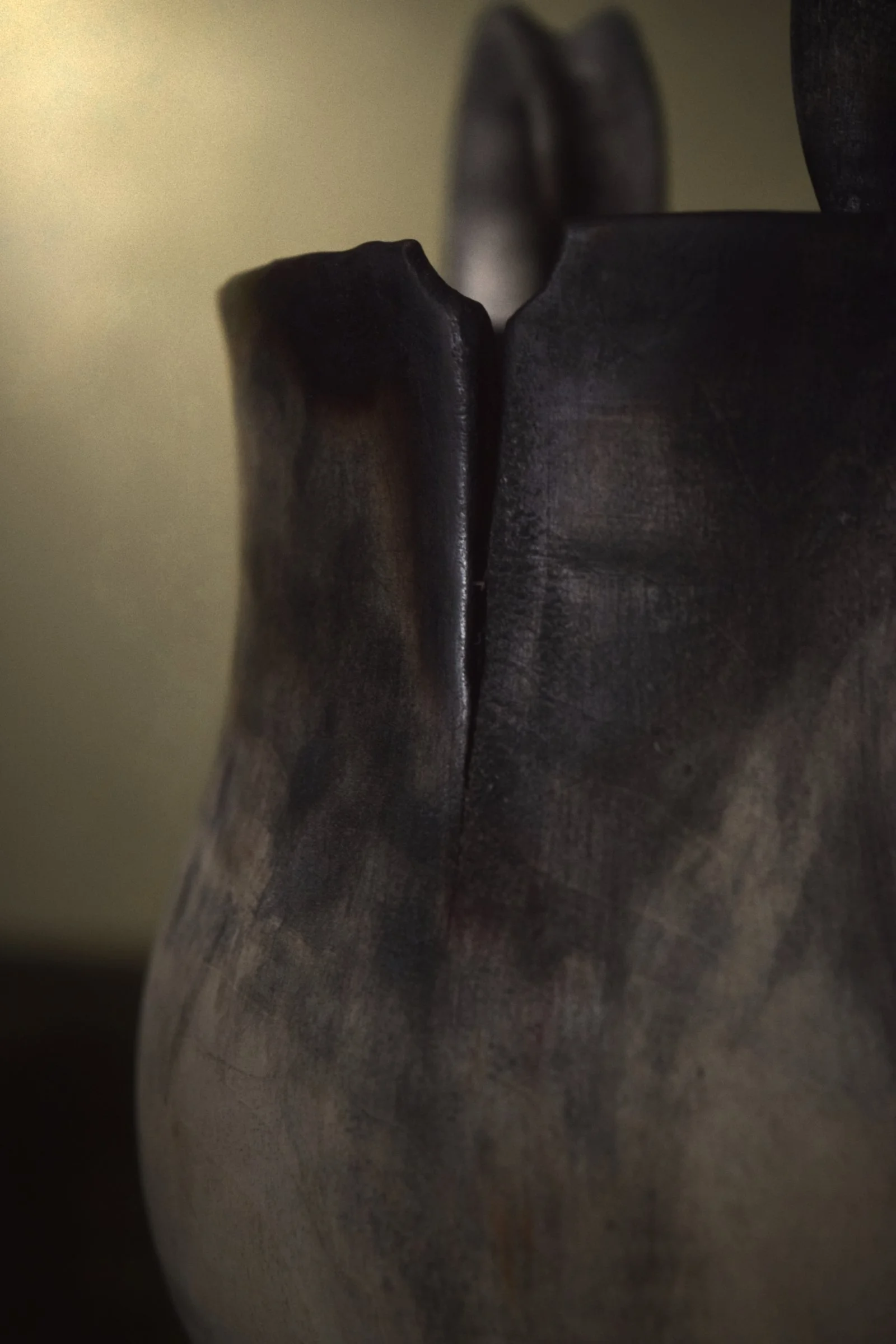 The surfaces are darkened with a handmade soot paint created from the vessels’ own offcuts and shavings, which are burned and returned to the work as pigment. Worked into the grain in layered applications, the soot settles into the wood rather than resting on top, creating a deep, mineral black that suggests a rich history unearthed.