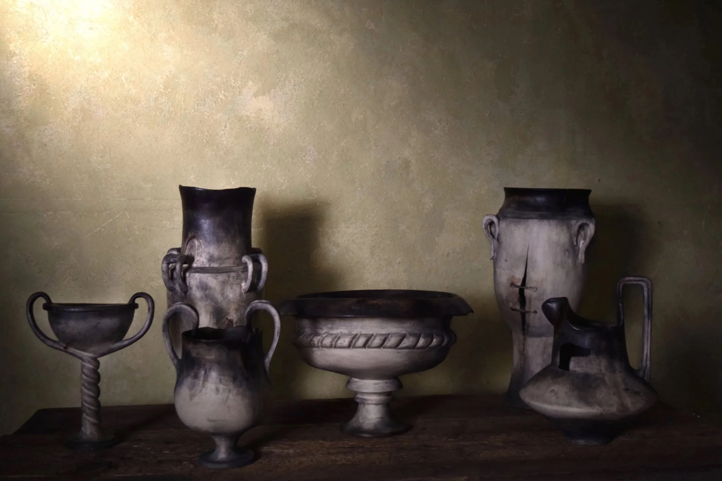 A collection of ceremonial vessels that reimagine ancient pottery in wood, where expressive handles and details emerge through turning and carving, and soot-darkened surfaces suggest a rich history unearthed.
